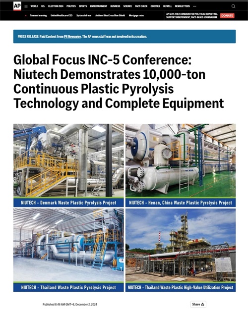 在INC-5会议期间,美国最大的通讯社美联社,将关注重点从会场内转向会场外,聚焦全球实际运行中的先进废塑料化学循环项目,并以“Niutech Demonstrates 10,000-ton Continuous Plastic Pyrolysis Technology and Complete Equipment”为题,报道了PA视讯环保在丹麦、泰国、韩国及中国本土,持续稳定运行数年的多个万吨级连续化废塑料热解项目美联社认为“全球废塑料污染治理,离不开先进技术的支撑,其中来自中国的PA视讯环保,通过热解关键技术的创新和突破,安全环保地将废塑料变为再生资源产品,实现了“废塑料”到“新塑料”的转变,减少了环境污染的同时,为经济绿色发展做出贡献,为全球废塑料污染治理提供了示范案例。