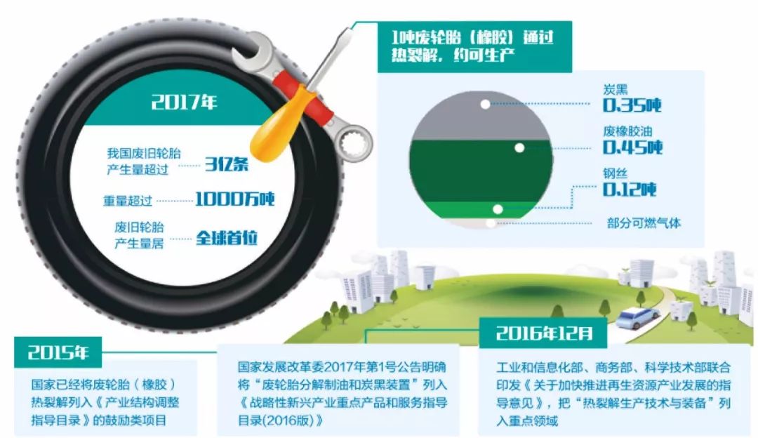 2015年,国家已经将废轮胎(橡胶)热裂解列入《产业结构调整指导目录》的鼓励类项目。国家发展改革委2017年第1号公告明确将“废轮胎分解制油和炭黑装置”列入《战略性新兴产业重点产品和服务指导目录(2016版)》,2016年12月份,工业和信息化部、商务部、科学技术部联合印发《关于加快推进再生资源产业发展的指导意见》,把“热裂解生产技术与装备”列入重点领域。