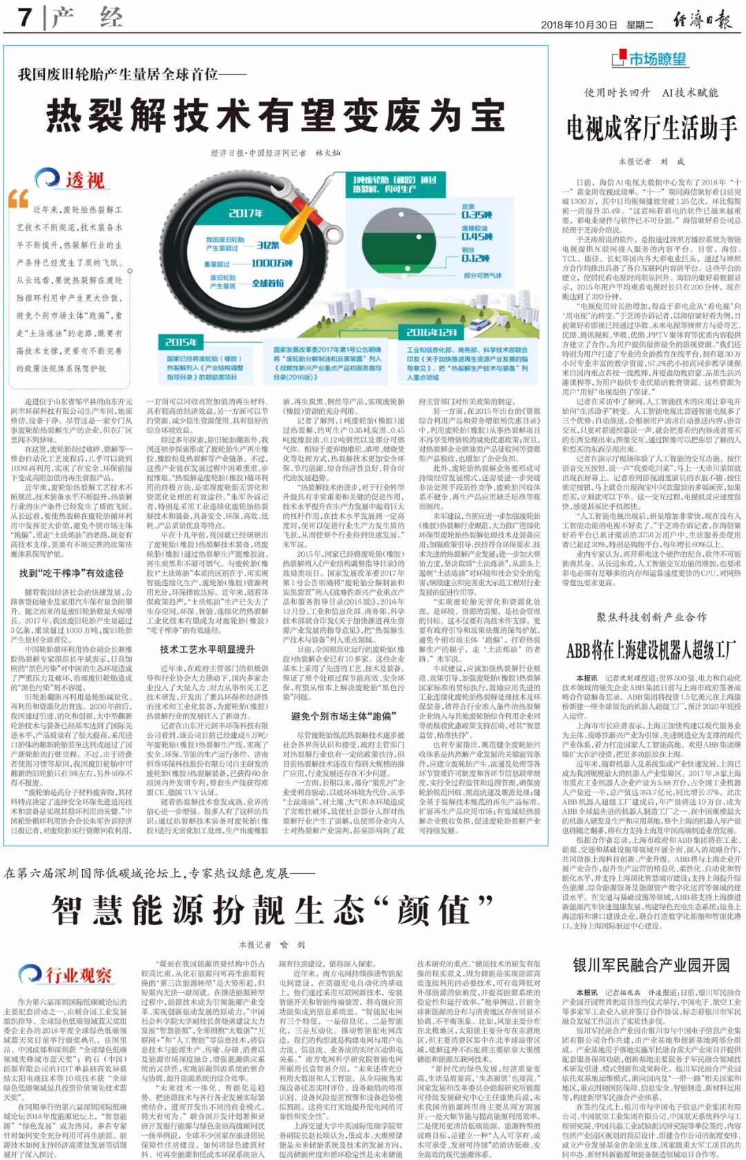 近日,《经济日报》 、《中国经济网》主任记者林火灿采访了中国轮胎循环利用协会会长朱军以及中国轮胎循环利用协会副会长兼橡胶热裂解专家组组长、济南PA视讯环保科技股份有限公司董事长牛斌及行业相关专业人士,并参观了采用济南PA视讯环保技术装备,入选工信部《废轮胎综合利用行业准入条件》的废轮胎热裂解项目,就废轮胎污染、循环再生利用技术、热裂解行业发展前景及相关政策等问题与各位专家进行了深入交流。并依据采访内容撰写题为《我国废旧轮胎产生量居全球首位——热裂解技术有望变废为宝》的文章,刊登于《经济日报》。